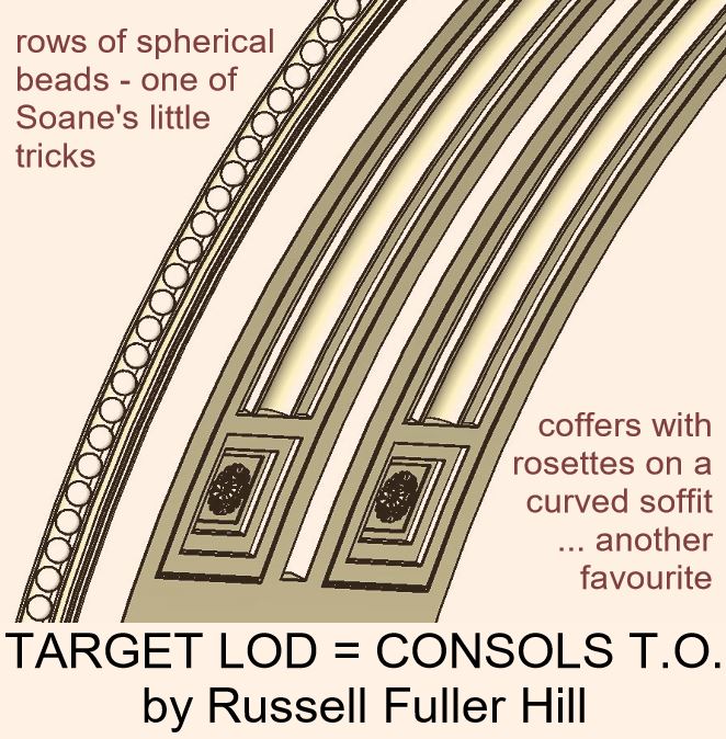 For such a small narrow space, Soane has gone to extraordinary trouble to articulate it volumetrically and to introduce dramatic lighting. Here you can see the plaster lining below the landing which is especially elaborate. I decided to take this challenge on myself. It uses a generous coved cornice to support a typical Soane shallow canopy dome. There's quite a bit of detail to add yet, I just made a start with the cartouche in the segmental arches below the dome. Let's see what Enscape3d makes of this space.